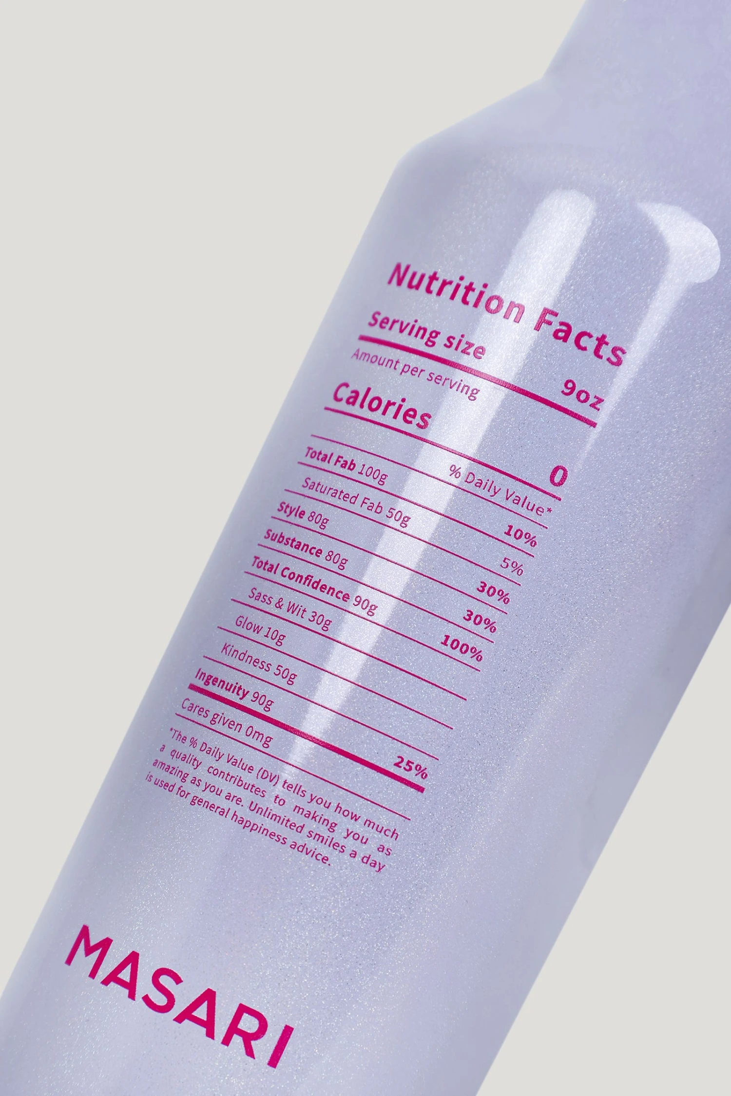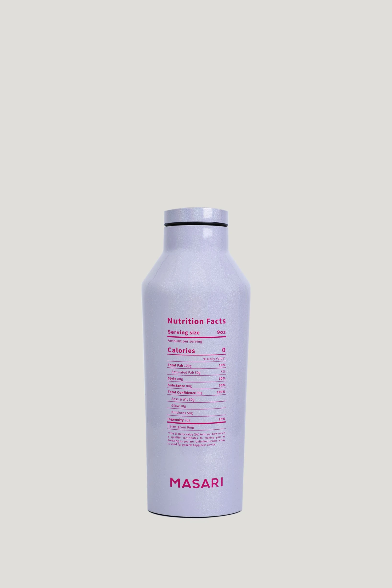 Add a little sparkle to every sip. Our limited edition collaboration with Corkcicle includes a Masari People nutrition label, and features a glossy, light-catching opalescent finish. Perfect as a gift or to add some glitter to your life. Canteens are available in an array of sizes and trend-inspired colors. Plus, they keep drinks ice cold for 25 hours or warm for 12. Made of 18/8 Stainless Steel and completely BPA Free. Detail: